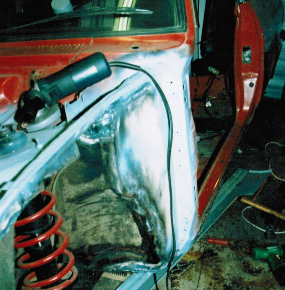 The passenger side sill panel was shot, so that had to be replaced as well, seam welding the top edge and plug welding the bottom.